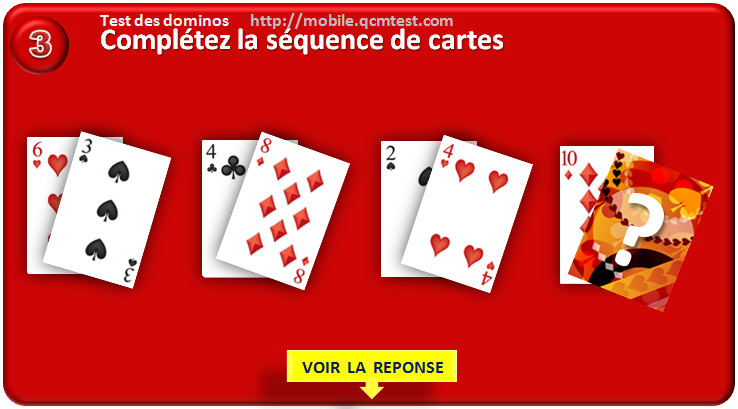 Correction du test des cartes n°3. Réponse Une carte rouge vaut le double d'une carte noir. Comme coeur et pique vont toujours ensemble, carreau doit venir toujours avec trèfle. Réponse : le 5 de trèfle.