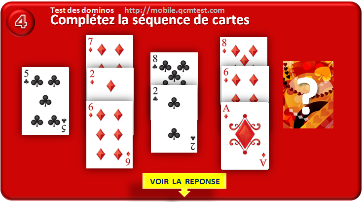 Correction du test des cartes n°4. Réponse La moyenne de chaque colonne est toujours 5. Les couleurs alternent entre trèfle et carreau. Réponse, le 5 de trèfle.