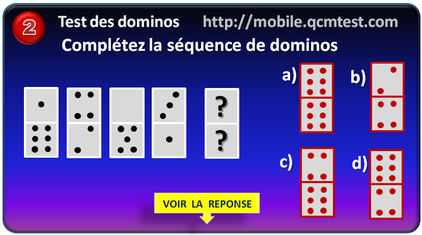 Correction du test de dominos n°2. Réponse : d) Série décroissante: on saute une valeur à chaque fois 1 (0) 6 (5) 4 (3) 2… en boucle. La série se lit de haut en bas en prenant successivement les dominos de gauche à droite.